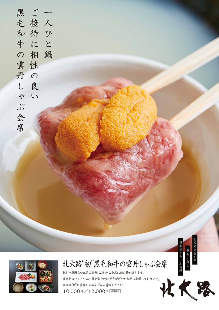 旬の雲丹を黒毛和牛とともに。新たな秋の味覚を数量限定でご提供。 全国各地より旬を迎えた雲丹を厳選し、黒毛和牛のしゃぶしゃぶとともにいただく北大路の新しい秋の味覚。 輝くようなオレンジ色と濃厚な旨味で、ご接待に華を添えます。