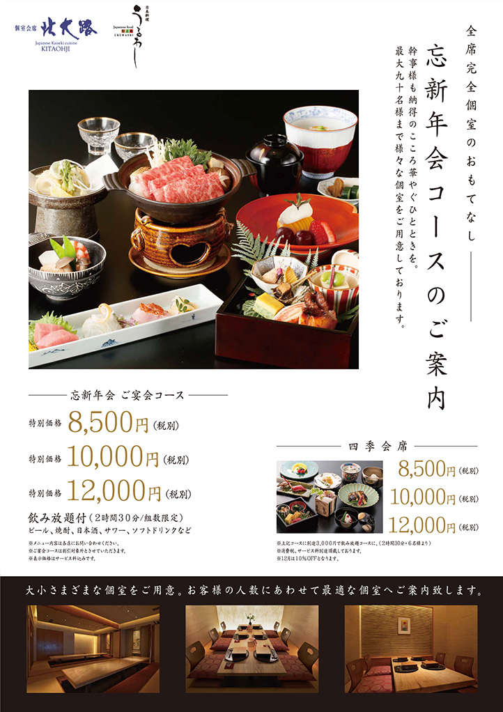 最大90名様まで様々な個室をご用意しております。 「個室会席 北大路」では、忘年会・新年会にご利用いただける飲み放題付きの会席コース「忘新年会コース」のご予約受付を開始いたしました。 ビール、焼酎、日本酒、サワー、ソフトドリンクなど、各種ドリンクが2時間30分飲み放題のご宴会コースです。