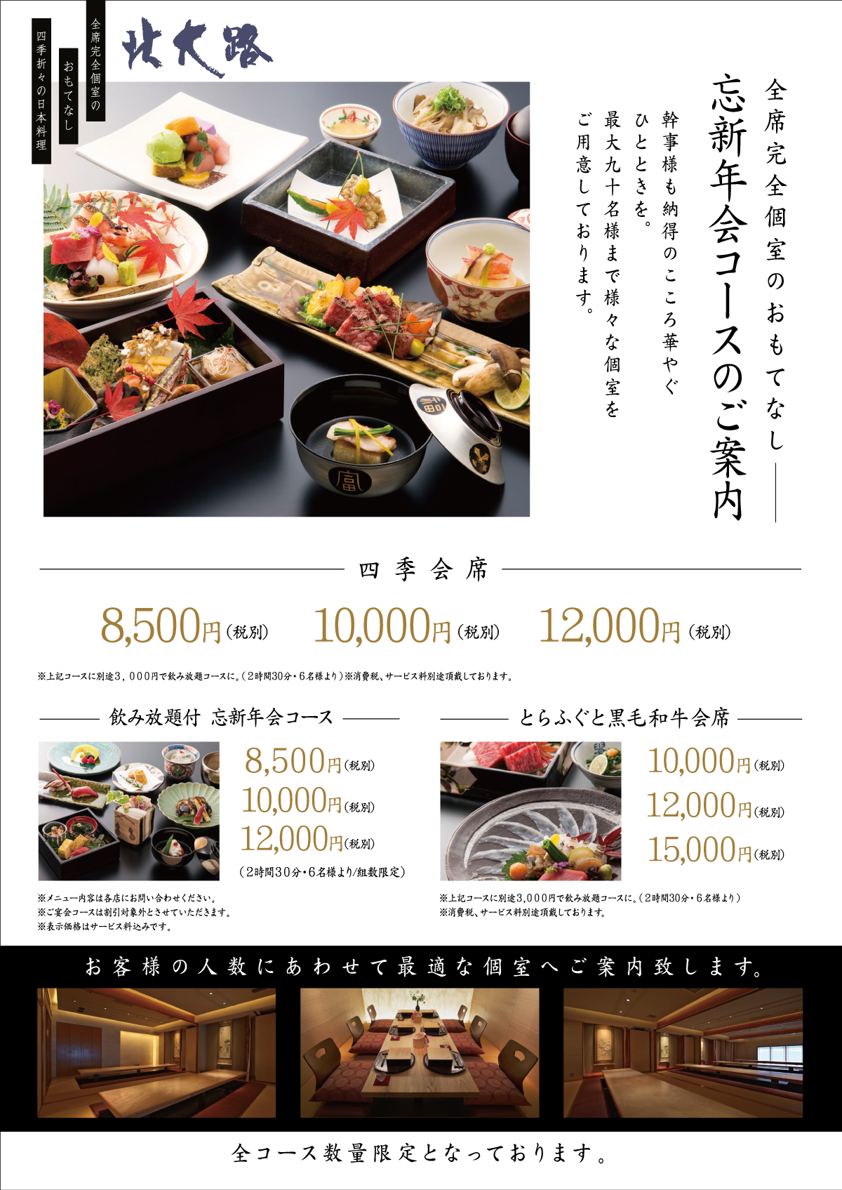 最大90名様まで様々な個室をご用意しております。 「個室会席 北大路」では、忘年会・新年会にご利用いただける飲み放題付きの会席コース「忘新年会コース」のご予約受付を開始いたしました。 ビール、焼酎、日本酒、サワー、ソフトドリンクなど、各種ドリンクが2時間30分飲み放題のご宴会コースです。