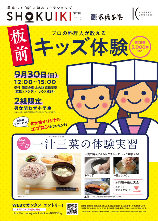 2018年9月30日(日)に日本料理の伝統技術を通じて食育を体験できる親子参加型のイベントを開催いたします。