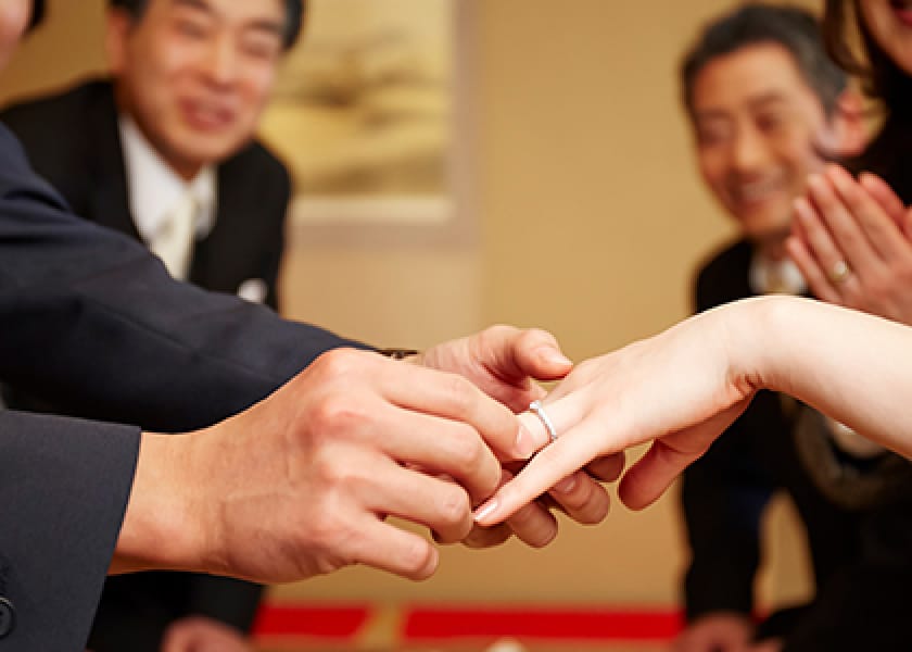 お席に着いたら縁起物の桜茶でまずは一息。見た目も華やかで心が和みます。会に先立って、彼からご挨拶を。ご両家のお父さまから始める場合もあります。カジュアルな場だとしても区切りをつけることで場も引き締まります。固くなりすぎないよう事前に内容を決めておくと慌てずに済みます。また、その流れでお互いの家族の自己紹介を済ませておきます。まずはふたりがお互いの親を紹介。基本的には男性側から挨拶します。挨拶が終わり場の空気が和んだところで、乾杯の前に婚約指輪などの記念品交換を。結納金がある場合もこのタイミングです。記念品にまつわるエピソードを添えて披露すると場が盛り上がります。